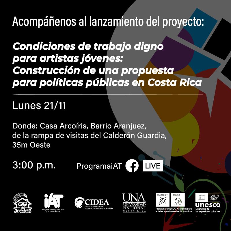 El Programa Investigación, Arte y Transmedia (iAT) y la oficina multipaís de la UNESCO invitan al lanzamiento del proyecto “Condiciones de trabajo digno para artistas jóvenes, una propuesta para políticas públicas en Costa Rica”